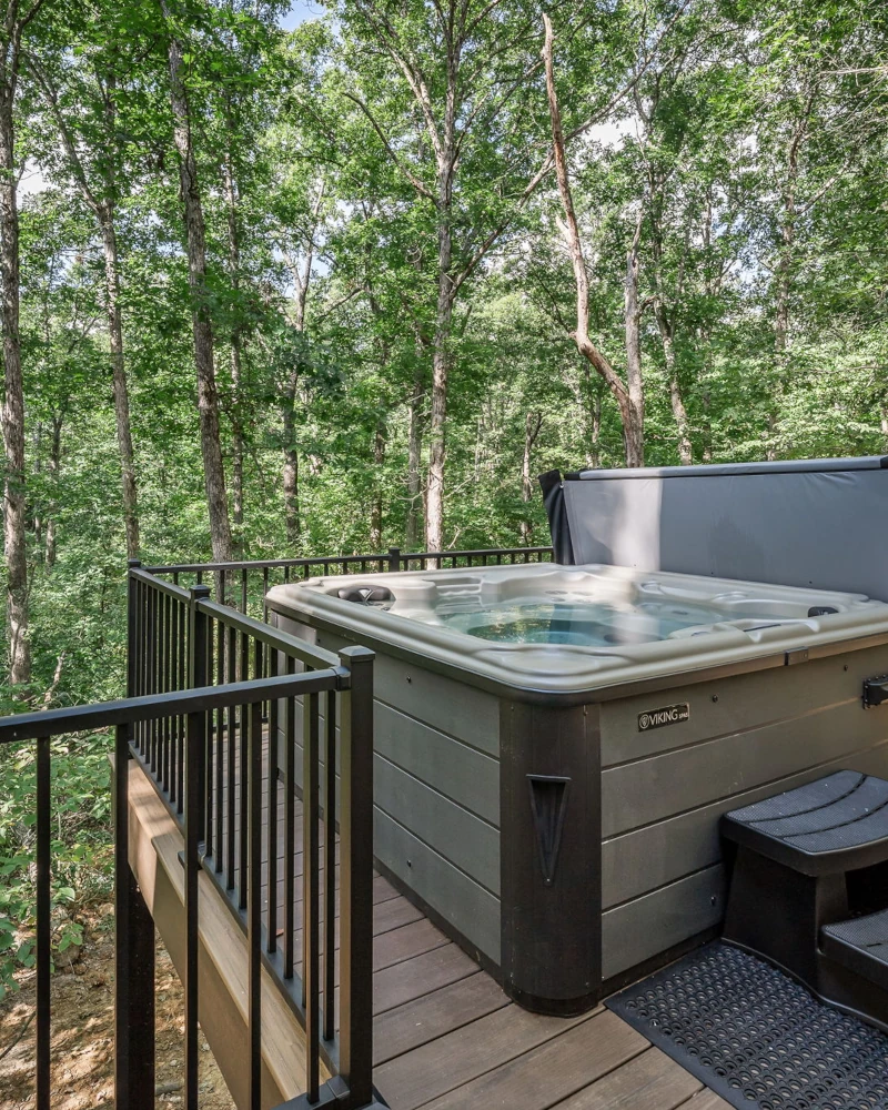 Enjoy a relaxing soak in a private hot tub nestled in the trees overlooking the lake.